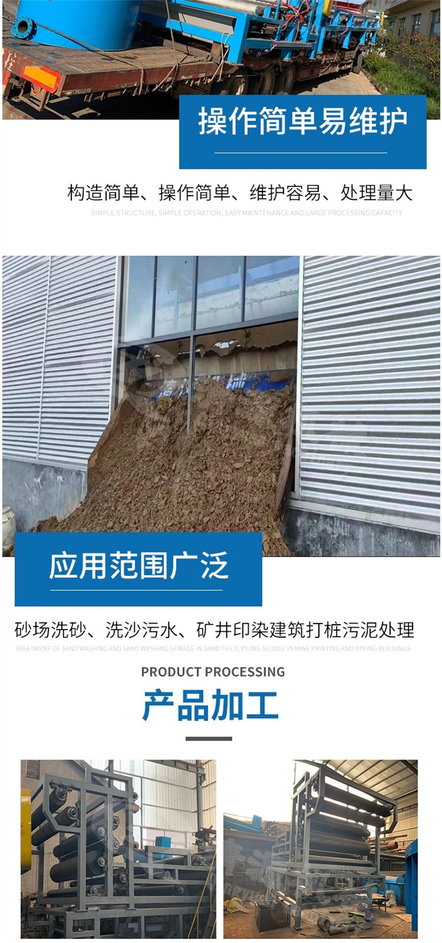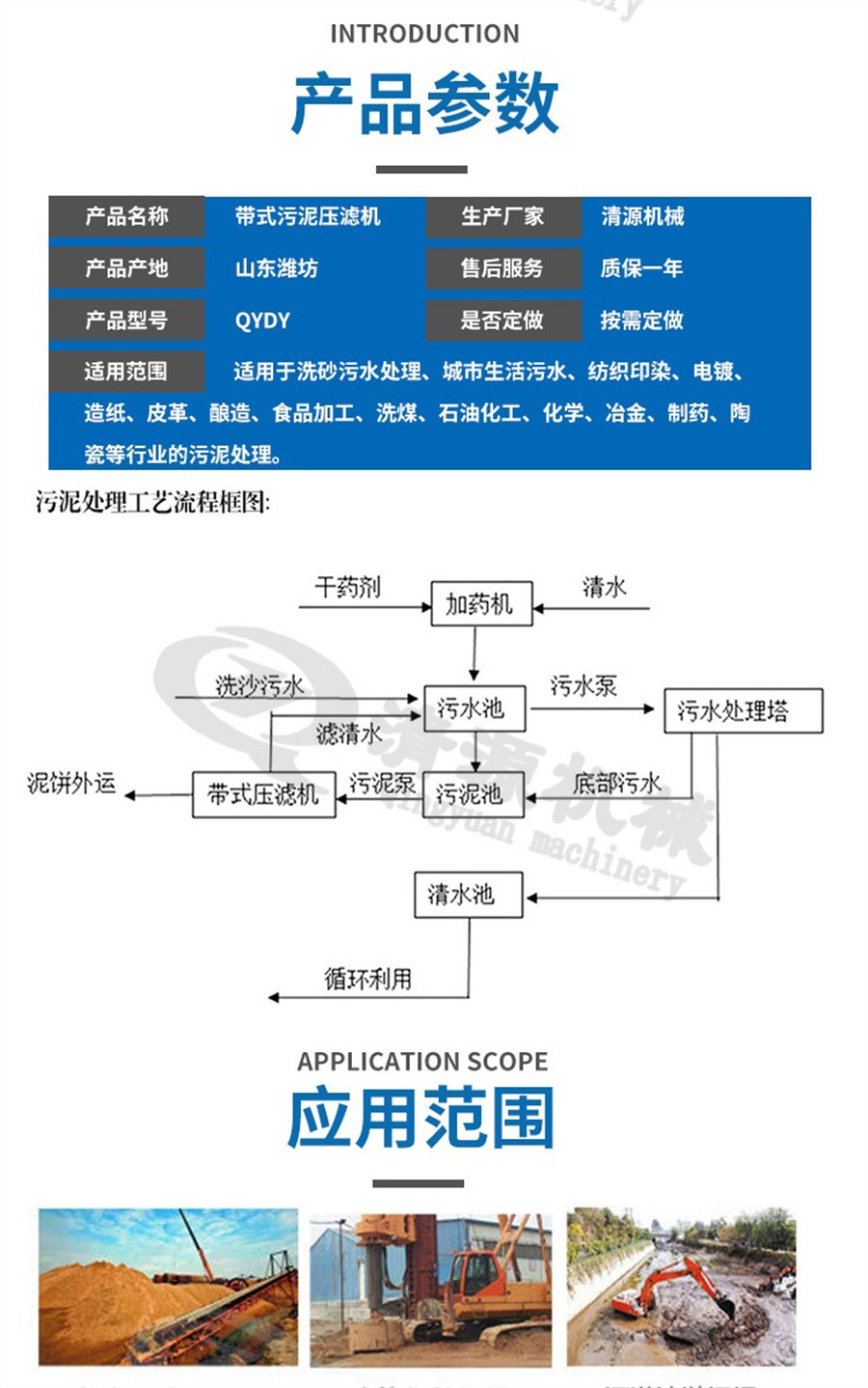 帶式壓濾機廣泛應用于城市生活污水、紡織印染、電鍍、造紙、皮革、釀造、食品加工、洗煤、石油化工、化學、冶金、制藥、陶瓷等行業的污泥脫水處理,也適用于工業生產的固分離或液體浸出工序。